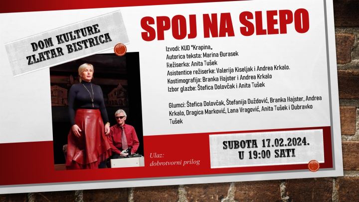 Općina Zlatar Bistrica poziva na ”Spoj na slepo” u Domu kulture u Zlatar Bistrici večeras s početkom u 19 sati. Predstavu izvodi KUD “Krapina”.