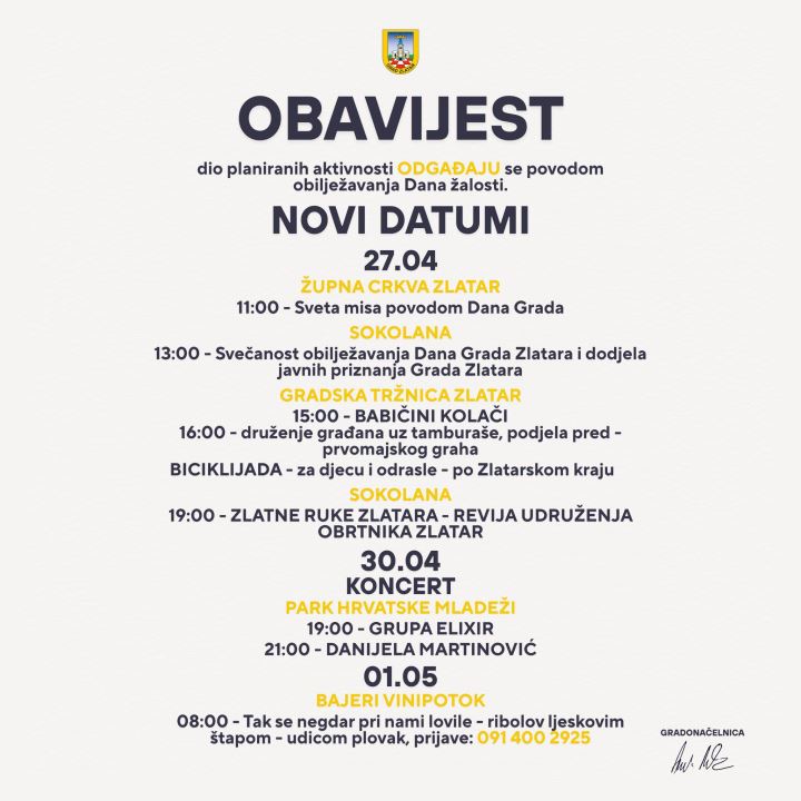 Zbog Dana žalosti u subotu, povodom smrti pape Franje, dio aktivnosti u sklopu Dana grada prebačen je na nove termine.