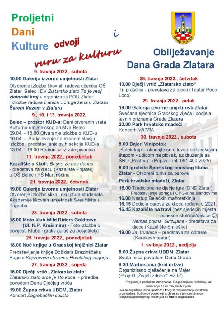 Ovogodišnja manifestacija „Proljetni dani kulture“, koju organizira zlatarsko Pučko otvoreno učilište dr. Jurja Žerjavića, počela je u subotu, 9. travnja, u Galeriji izvorne umjetnosti izložbom dječjih likovnih radova, učenika zlatarske i belečke osnovne škole i polaznika dječjeg vrtića „Zlatarsko zlato“.