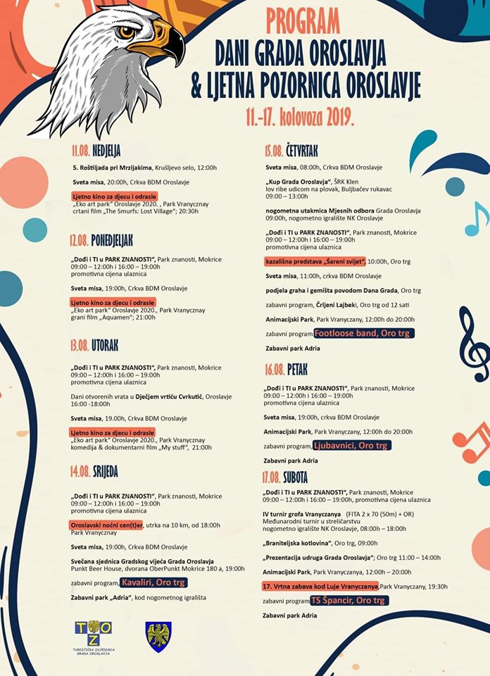 U Oroslavju će se i ove godine održati brojna događanja povodom Dana grada. Sutra 11. kolovoza s početkom u 12 sati održat će se tradicionalna 5. Roštiljada pri Mrzljakima u Krušljevom Selu. U 20 sati se održava sveta misa u crkvi BDM.
