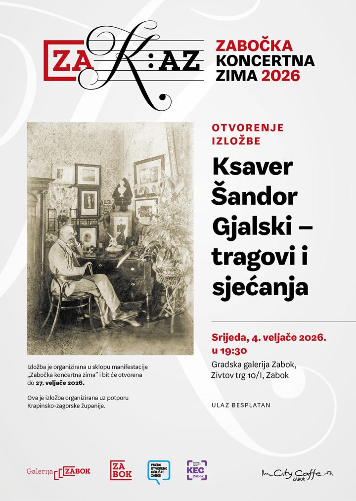 Pučko otvoreno učilište Zabok poziva na otvorenje izložbe 'Ksaver Šandor Gjalski – tragovi i sjećanja', koje će se održati u srijedu, 4. veljače 2026. u 19:30 sati u Gradskoj galeriji Zabok (Zivtov trg 10/I).