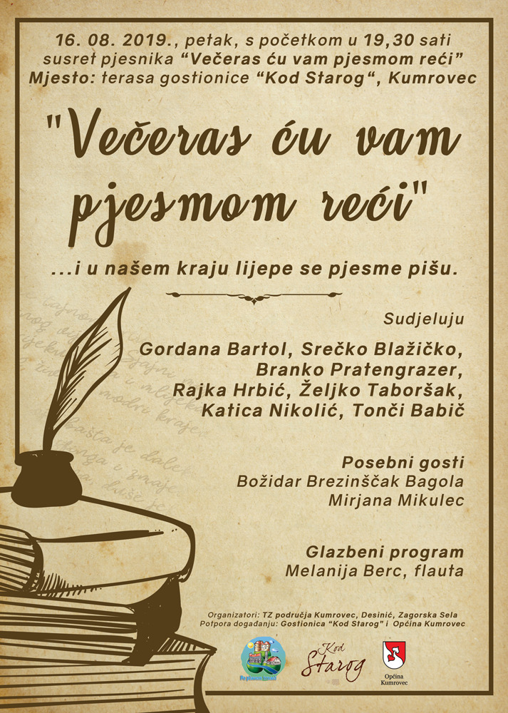 Ovog petka, 16. kolovoza na terasi Gostionice 'Kod Starog' u Kumrovcu održat će se susret pjesnika 'Večeras ću vam pjesmom reći'.