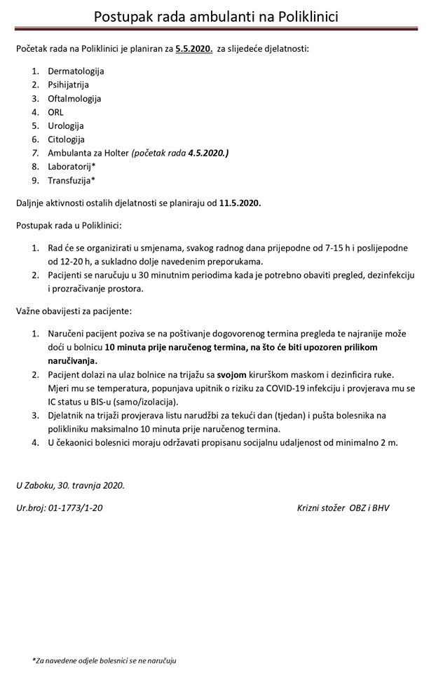 Od 11. svibnja vraćaju se i operacijski zahvati. Više informacija može se potražiti i na web stranicama OB Zabok.