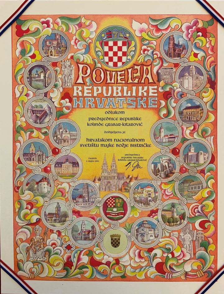 Između ostalih, Predsjednica RH Kolinda Grabar Kitarović, povelju Republike Hrvatske je uručila i Svetištu Majke Božje Bistričke, a primio ju je rektor Svetišta Majke Božje Bistričke i župnik u Mariji Bistrici preč. Domagoj Matošević, koji je zahvalu započeo zanimljivom prispodobom.