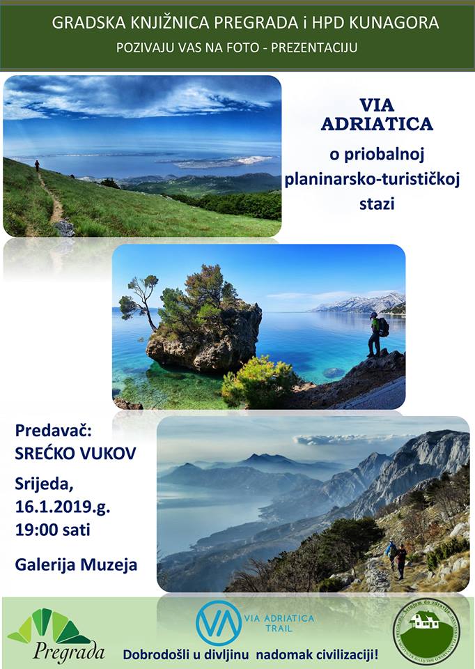 Gradska knjižnica Pregrada i HPD Kunagora Pregrada pozivaju sve ljubitelje prirode, planina i avanturizma na foto-prezentaciju VIA ADRIATICA o mega turističko-planinarskoj stazi u Hrvatskoj, koja povezuje naše najatraktivnije planinske masive cijelom dužinom prelijepe jadranske obale.